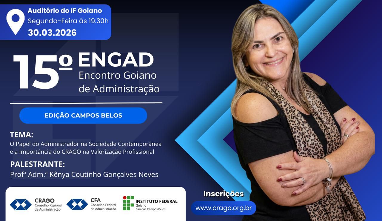 O Conselho Regional de Administração de Goiás (CRAGO), o 15º ENGAD - Encontro Goiano de Administração, com o tema “O Papel do Administrador na Sociedade Contemporânea e a Importância do CRAGO na Valorização Profissional", que será apresentada pela administradora Kênya Coutinho Gonçalves Neves.