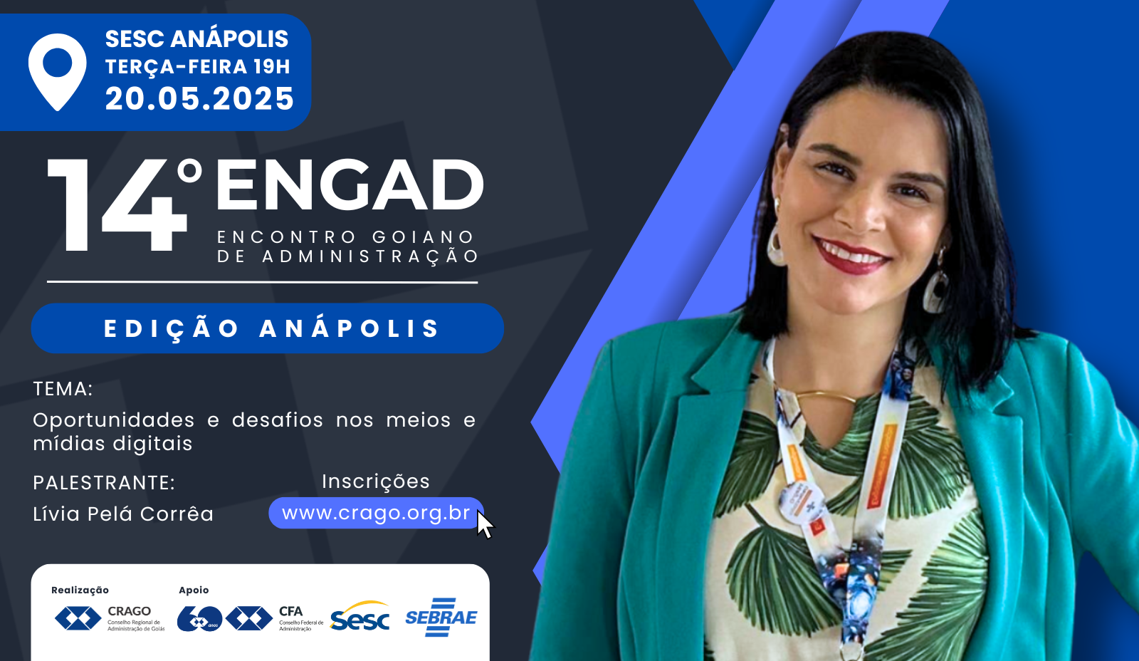 A 14ª edição do Encontro Goiano de Administração - Edição Anápolis, será realizada no dia 20 de maio, às 19h, no auditório do Sesc, em Anápolis. Na ocasião, Lívia Pelá Corrêa, ministrará a palestra:"Oportunidades e desafios nos meios e mídias digitais. o evento tem como objetivo facilitar e democratizar o acesso a cursos de capacitação e promover a constante atualização profissional. “O evento faz parte das comemorações do Jubileu de Diamante da profissão (1965/2025)”, ressaltou Albernaz.